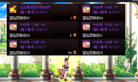 2.按剧情任务跑将角色升到满级(升级过程可以用冒险团的升级券和道具加速升级),在满级前技能选择自动加点即可;