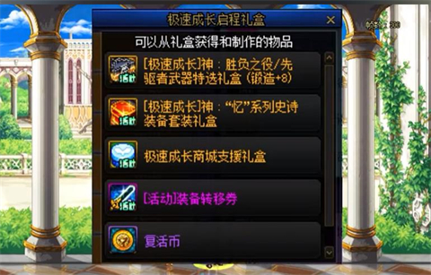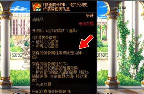 礼盒中会直接给武器盒子和一套三词条的固定史诗套装,装备等级固定为神1级,附魔和打孔都完成。