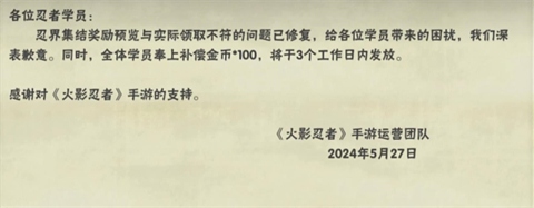 忍界集结奖励预览与实际领取不付的问题已修复,给各位学员带来的困扰,我们深表歉意。同时,全体学员奉上补偿金币*100,将干3个工作日内发放。