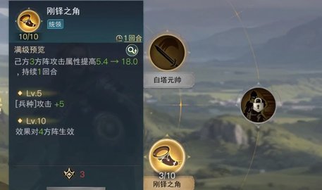 我们再来看两位史诗级指挥官波洛米尔的技能,可以为己方四方阵提供一回合18点的高额攻击属性加成,并且技能冷却只有一回合