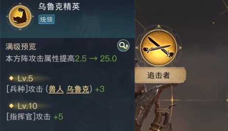 在技能上鲁特兹可以为本方阵提供高额的攻击属性提高,满级后高达足足25点,如果方阵兵种是乌鲁克的兽人这个数值还有进一步的提升,别看这个技能好像非常单调,但这类纯粹提升攻击数值的技能在游戏里可并不多见,更何况在满级后鲁特兹还会单独为自己提供五点的指挥官攻击属性加成