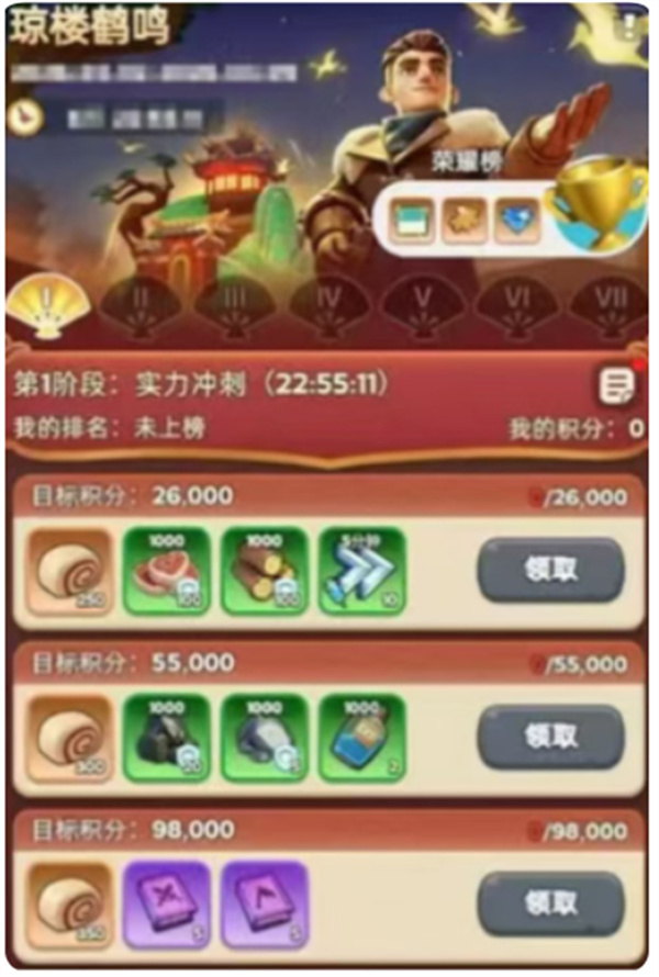 主要奖励:排名奖励为限定名片【鹤隐仙山】。