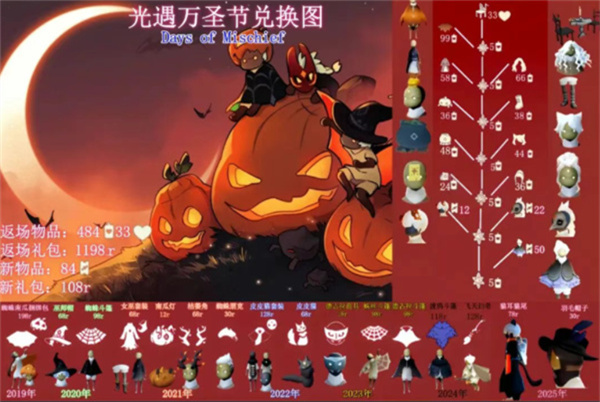 光遇一年一度的万圣节庆典即将到来,不仅有全新的节日限定装饰,往年备受玩家喜爱的热门物品也将再度返场。为了让玩家更好地规划蜡烛和代币的使用,闪电小编整理了2025年万圣节活动的兑换图和物品信息,供玩家参考。