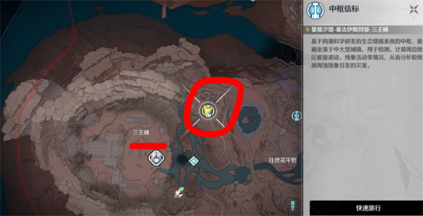 1、【黎那汐塔 - 桑古伊斯狩原】区域,传送至“三王峰”右上角的中枢信标。