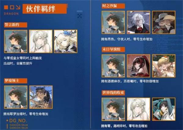 羁绊效果多为生命值、防御力或团队增益类,进一步强化零号在前排的战术价值。