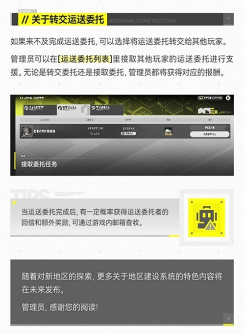 如果管理员无法按时完成运输委托,可以选择将委托转交给其他玩家。同样,管理员也可以在委托列表中接取其他玩家的任务进行协助。无论是转交还是协助,管理员都能获得相应的报酬。委托完成后,有概率收到需求方的回信和额外奖励,这些奖励可以在邮箱中查看。