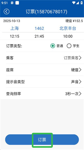 4、仔细核对乘车人信息、车次、日期及席别等详情,确认无误后点击【订票】。