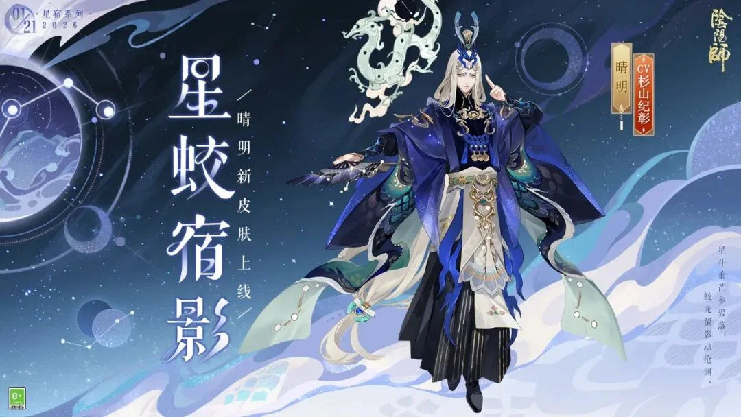 阴阳师晴明全新步野观星系列皮肤星蛟宿影,1月21日维护后至2月10日限时上线!以星宿与苍龙为核心元素,蓝黑主调搭配烫金纹饰,还附带专属姿度与收集福利,下面从外观、特效、获取方式三方面全面解析,帮你判断是否值得入手。