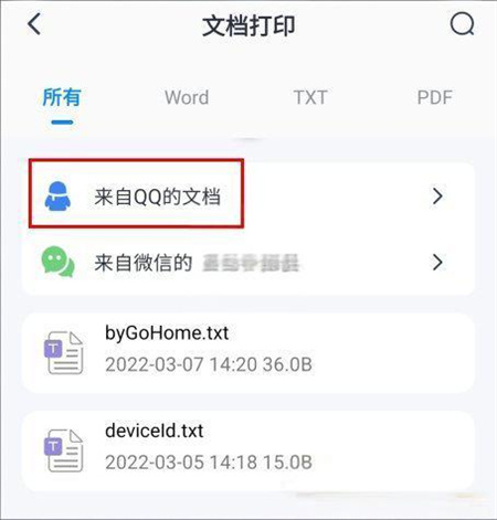 2、在文档打印页面中选择【来自QQ的文档】选项;
