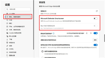 2、在左侧菜单中选择“隐私、搜索和服务”,向下滚动至【安全性】部分,关闭“Microsoft Defender SmartScreen”以及“阻止可能不需要的应用”两项功能;