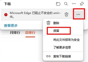 1、当出现“Microsoft Edge已阻止不安全的XX文件”提示时,点击右侧的“三个点”图标,选择“保留”;