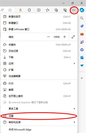 1、打开Edge浏览器,点击右上角“三个点”图标,进入“设置”界面;