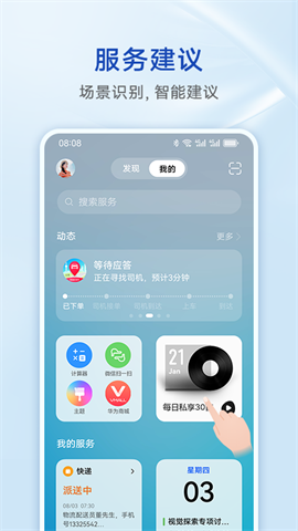 3、动态以服务卡片的形式,提供出行、生活和工作类事项场景化提醒和第三方增值服务。