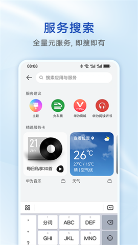 2、服务直达快捷服务入口,聚合生活服务、娱乐购物和实用工具三大类服务,根据您的自定义设置和使用习惯智能展示,即点即用,一步直达。