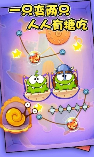 2、玩家需要使用剪刀或绳索等工具,在不同位置剪断绳索,让糖果落入小怪兽的嘴里。