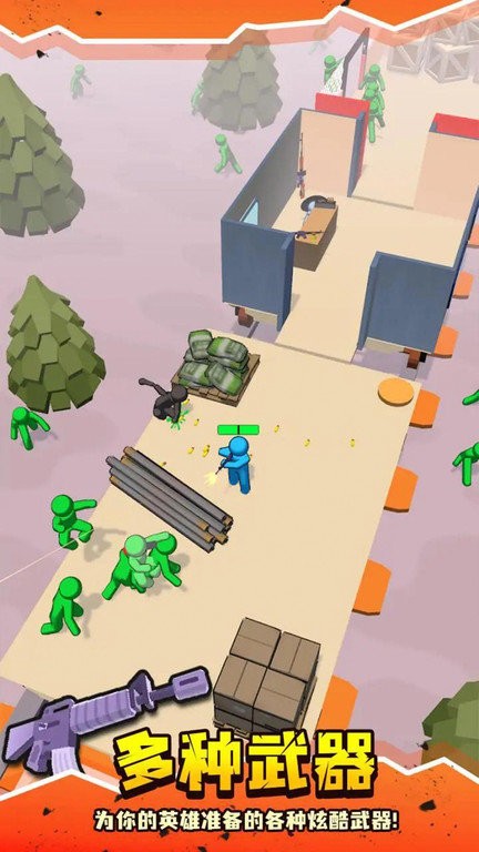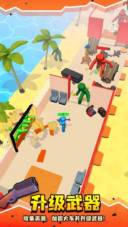 1、建造防御工事,使用多种武器保卫火车!变得更强并射击所有人!射击僵尸,收集资源,强化火车并升级武器!