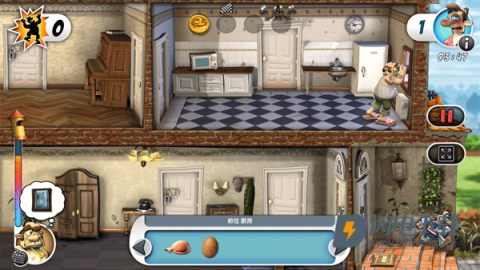 从客厅柜子拿“放屁坐垫”;餐厅拿到“强力胶”;厨房冰箱取“鸡蛋”,合理使用强力胶、鸡蛋等道具让邻居狼狈不堪。