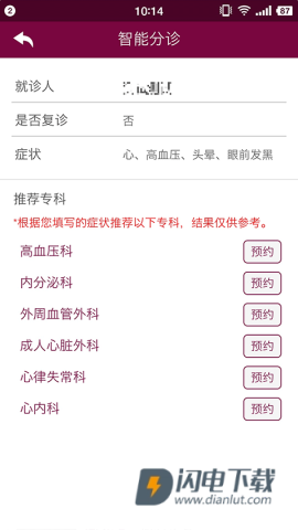 5、进入智能分诊版块,输入就诊人信息和症状,推荐对应专科进行预约。