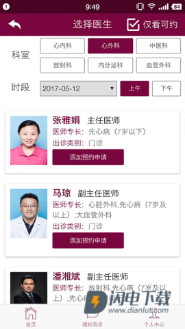 2、在首页点击预约挂号,选择科室和时间段,自由选择医师并添加预约申请。
