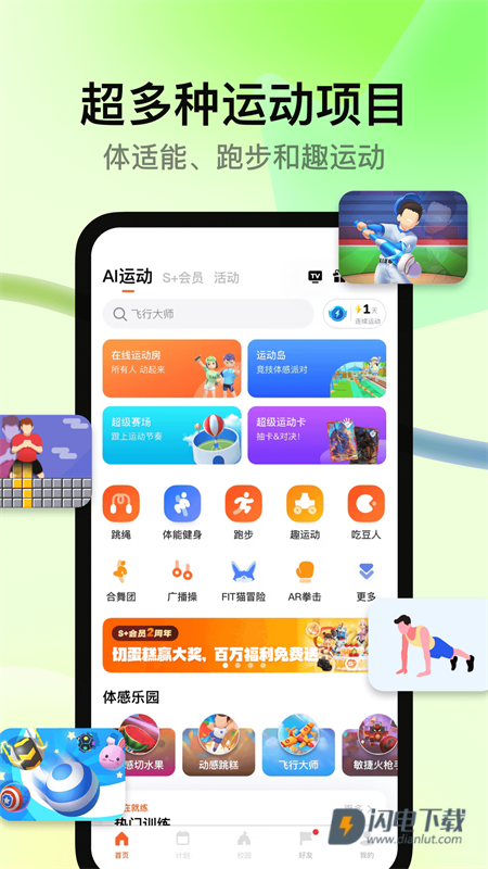 2、你无需通过屏幕操作虚拟角色,而是亲身参与游戏。无论是经典还是创新的训练动作,这里应有尽有:切水果、吃豆人、跳绳、跳舞、跑步、健身,还有羽毛球、乒乓球等趣味竞技。