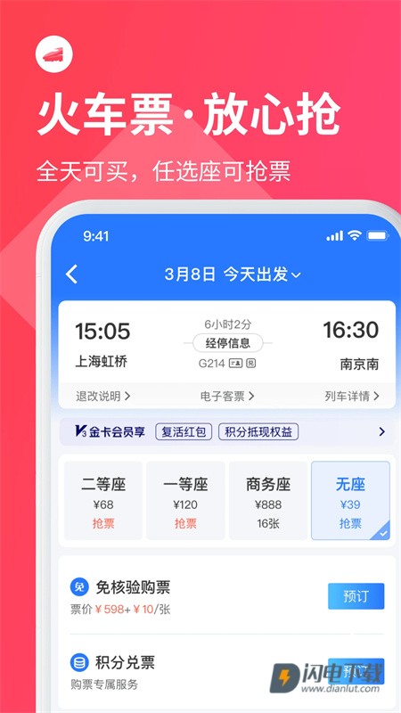 火车票预订轻松便捷。支持学生票及儿童票,能够直接连接12306购票;采用极速抢票功能,排队不再是问题。提供退改签和私人订制服务,并支持电子票,一键出票,大大提高出行效率。