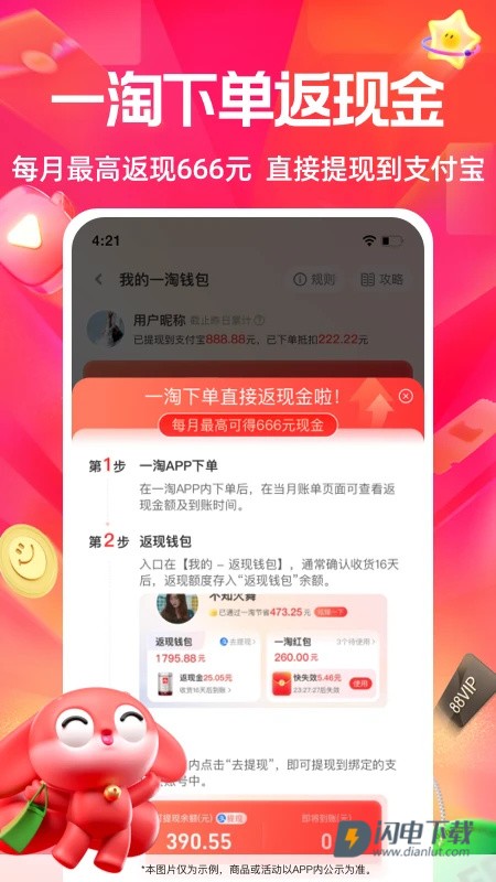 返利将在个人页面的一淘钱包中发放,点击钱包即可提现到支付宝。