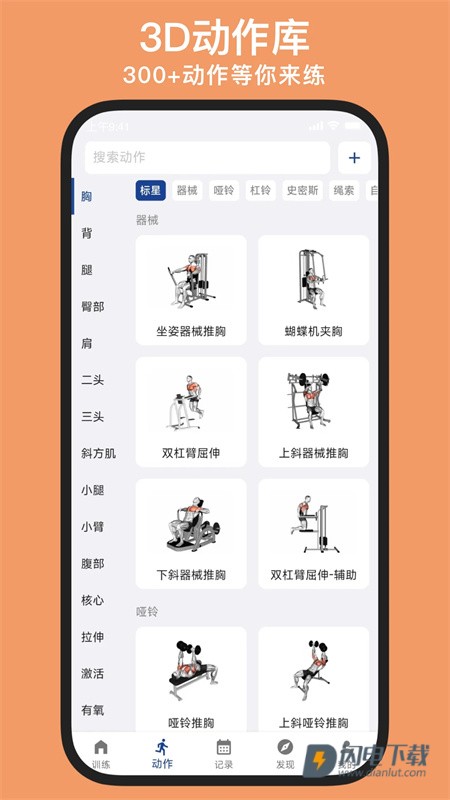 2、进入动作页面后,在3D动作库中选择不同部位如胸、背、腿、肩等,系统提供300+标准训练动作供用户自由学习和参考。