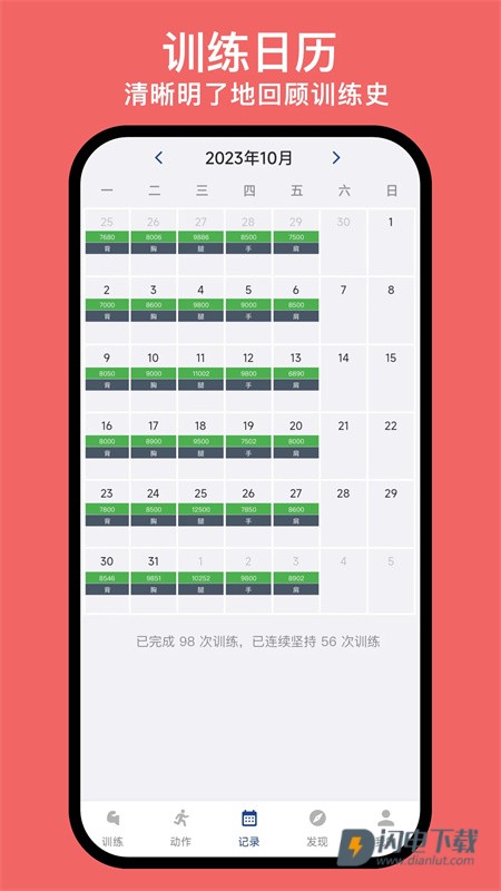 4、发现页面设有训练数据统计和运动打卡记录,帮助用户追踪健身进度。