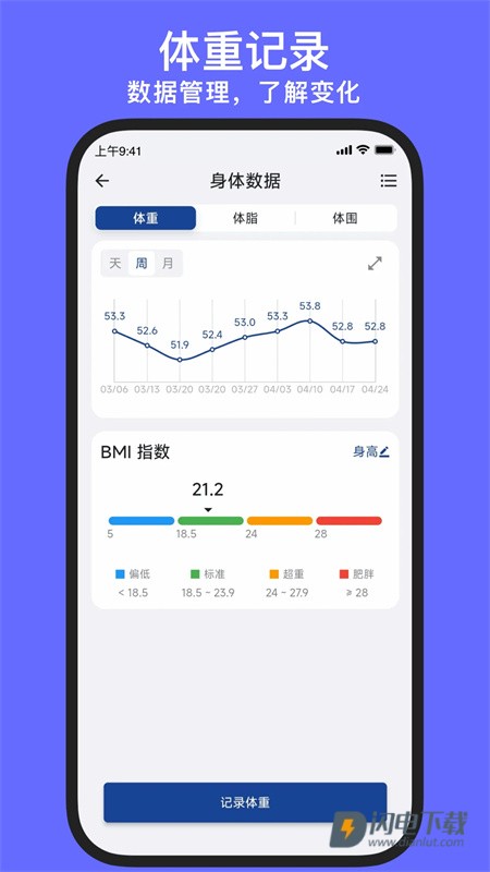 3、用户可在身体数据页面记录体重、体脂和体围,应用会自动生成BMI指数和折线图,以帮助实时跟踪身体变化。