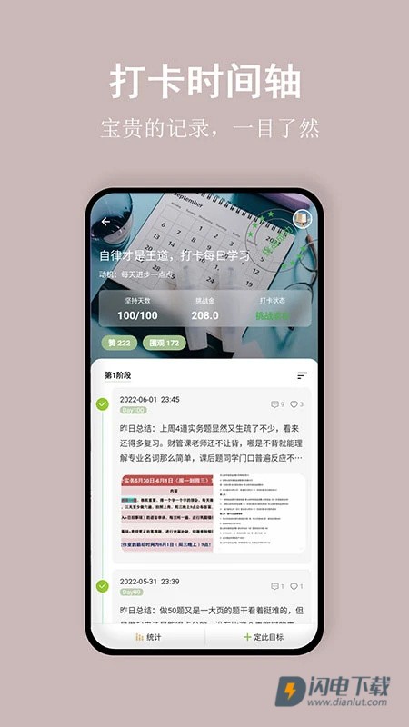 2、打卡记录系统提供文字、图片等多种记录方式,时间轴清晰展示你的成长轨迹,提升成就感。