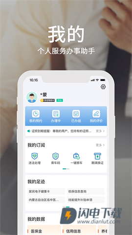 5. 【我的】提供个人空间,方便快捷地查询支付、社保、公积金并整合电子证件及个人办事提醒。