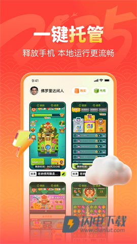 2、挂机托管,轻松实现游戏挂机托管,云端全天候运行,彻底解放你的手机内容,避免时间浪费带来的困扰。