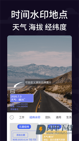 3、点击水印功能,可以选择工作、经纬度、水印、团队和生活等不同类别,为照片添加时间、地点和天气等信息。