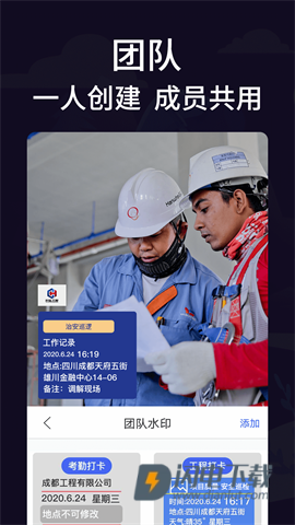 1、定位考勤打卡app适用于物业、安保、工程、维修、物流、执法等多个行业,内置多款专业水印模板,还能自定义团队品牌水印,方便进行统一管理。