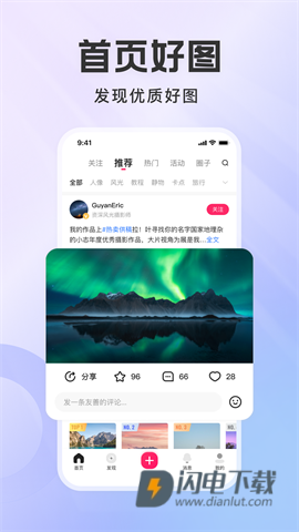完美呈现创作意图,展示拍摄器材和设置参数,优秀摄影作品值得借鉴;通过一键上传手机相册照片,随时分享自己的佳作。