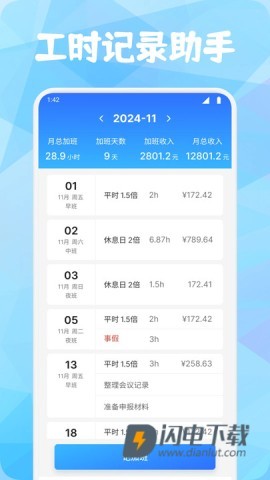 软件还给你提供了精确的打卡数据和加班时长统计,月收入一目了然,全面掌控财务状况。
