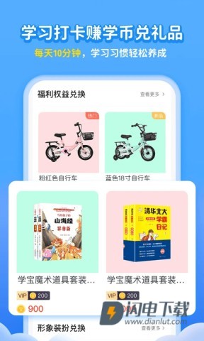 完成学习任务即可获得学币,可免费兑换多种学具、玩具以及卡通形象、背景、皮肤装扮,帮助孩子养成良好学习习惯,增强学习动力。
