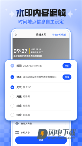 会自动获取当前时间、准确定位和实时天气数据,合成到照片中,为用户提供专业的水印服务。