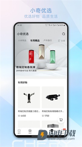 5、点击底部“商城”,进入小奇优选购物页面,浏览车用精品、户外旅行及科技类产品,便捷购置。