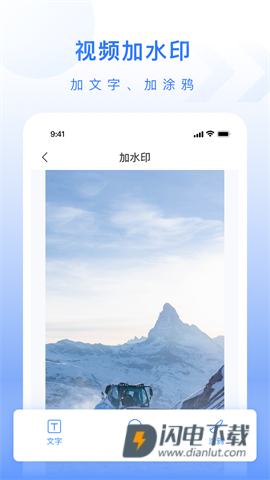 3、在“视频加水印”功能中,可通过点击“文字”添加水印,同时支持贴纸和涂鸦功能。