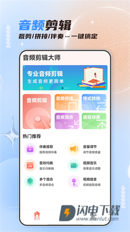 1、在首页,你能快速找到音频剪辑、拼接和格式转换等核心功能,配合伴奏提取和音量调节,基本的音频处理需求全部能满足。