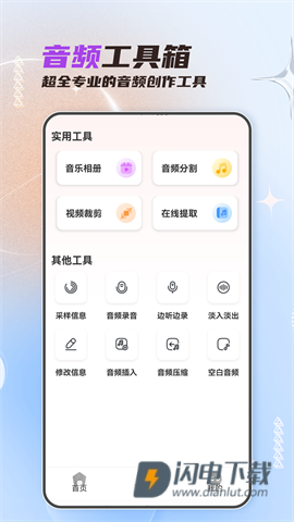 2、进入工具箱,您会发现音乐相册、视频消音等实用工具,以及采样信息和音频特效等其他强大功能,助你进行更为细致的音频编辑。
