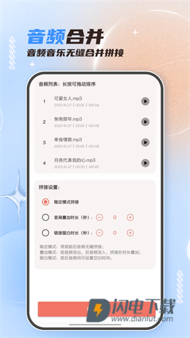 4、音频合并:多个音频文件轻松无缝拼接,制作完美的铃声,让每一次来电都有不一样的享受。