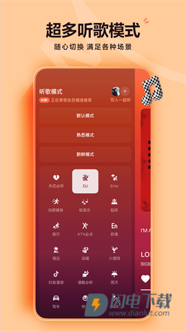 4、汽水音乐App自带多种模式,点击左上角可进行切换,包括默认模式、熟悉模式和新鲜模式等。