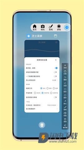 2、进入设置页面后,找到“录屏高级设置”,其中包含悬浮窗、画笔、视频方向、声音来源等选项,点击“录制时隐藏悬浮窗”进行启用。