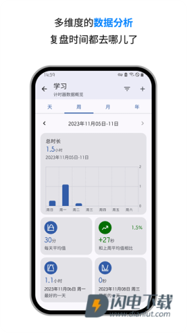 3、应用记录每一个计时器的使用日志,并汇总成柱状图和饼状图,让用户可以根据天、周等方式轻松查看自己使用计时器的情况。