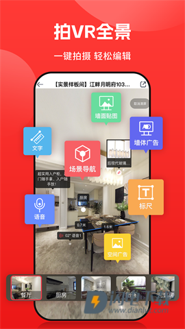 3、全景编辑:提供强大的编辑功能,可在全景作品中嵌入音乐、语音、文字、图片、视频、GIF动图、导航信息及品牌标识等。