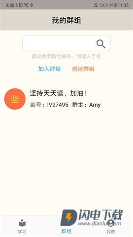 1、在学习页面,点击底部导航栏的【群组】选项,进入“我的群组”页面,即可开始进行群组相关操作。