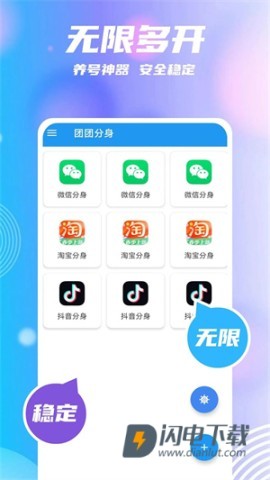 1、团团分身支持无限多开的主流应用,让你尽情畅玩,互不干扰。