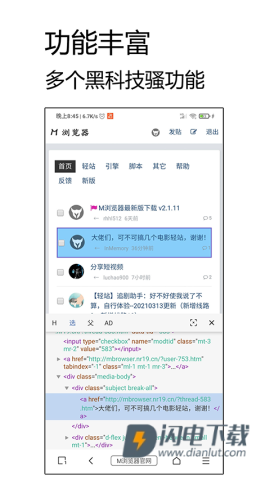 4、提供站点级配置、UA模拟、资源嗅探、简易元素审查,内置HTML与JSON语法高亮及多项常用浏览能力